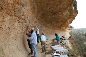 Shumla archaeologists conduct digital microscopy to determine the order the paint was applied to an ancient mural at Jackrabbit Shelter. Photo courtesy of Shumla Archaeological Research & Education Center