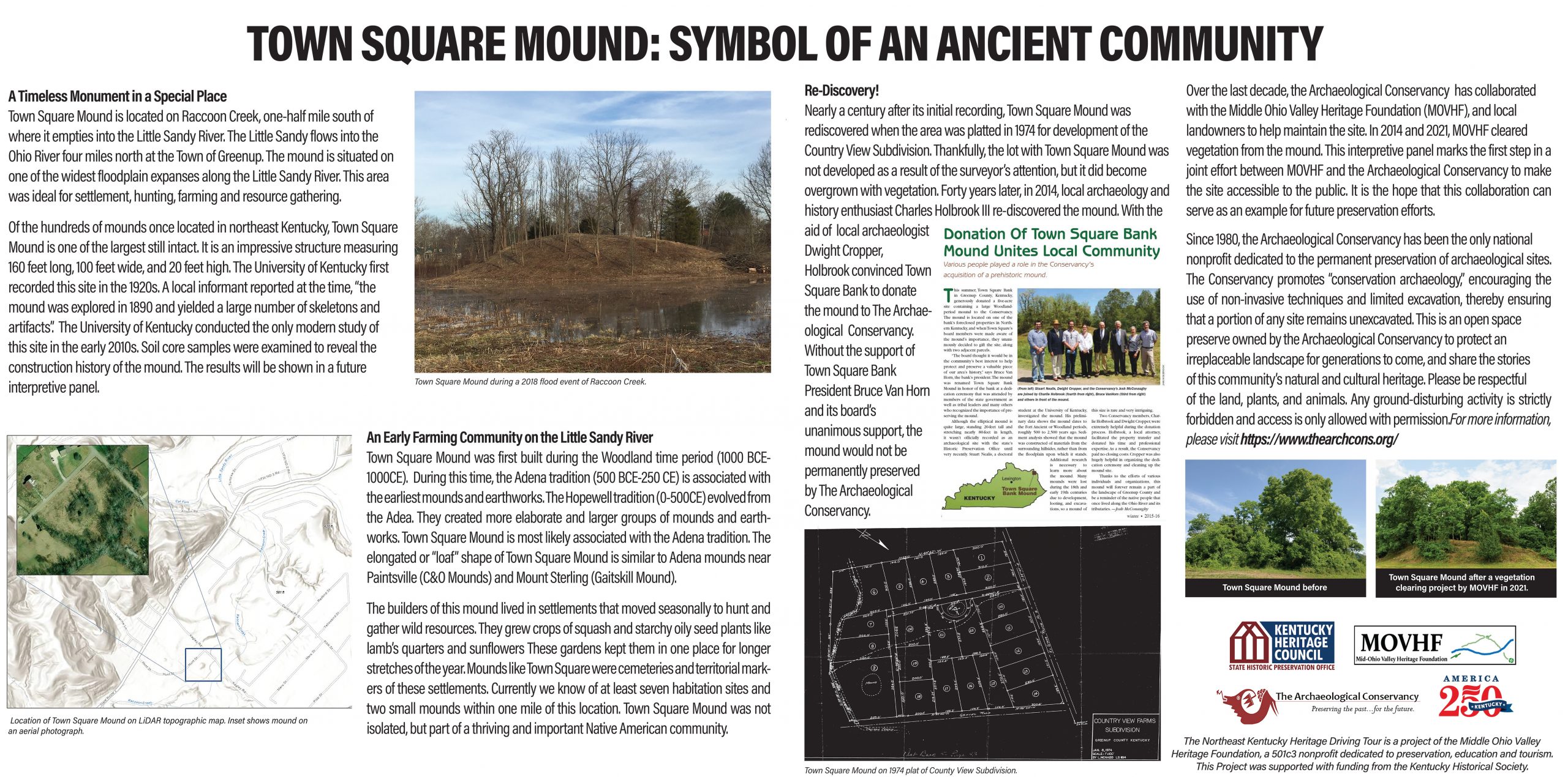One featured stop is the Archaeological Conservancy’s Town Square Mound Archaeological Preserve, an Early Woodland Adena mound dating to roughly 500 B.C. through A.D. 250. Donated by Town Square Bank in 2015 for permanent preservation, the mound and surrounding land are currently undergoing restoration and vegetation clearing to reduce erosion and prevent damage from large root systems.